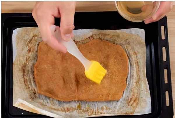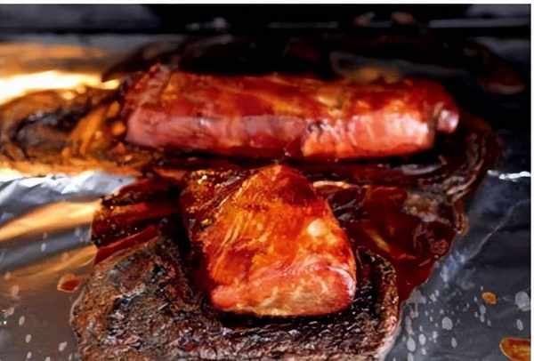 5.烤箱预热160°C,把肉放在中层烤8分钟定型。随着肉中水分的干燥,肉会相应地收缩和起皱。定型后取出肉,两面刷上调好的蜂蜜水。