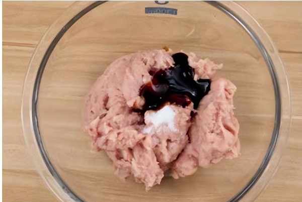 2、将所有调料(蜂蜜和白芝麻除外)放入肉末中搅拌均匀,搅拌至肉呈块状、粘稠不散开即可。盖上保鲜膜腌1小时入味。