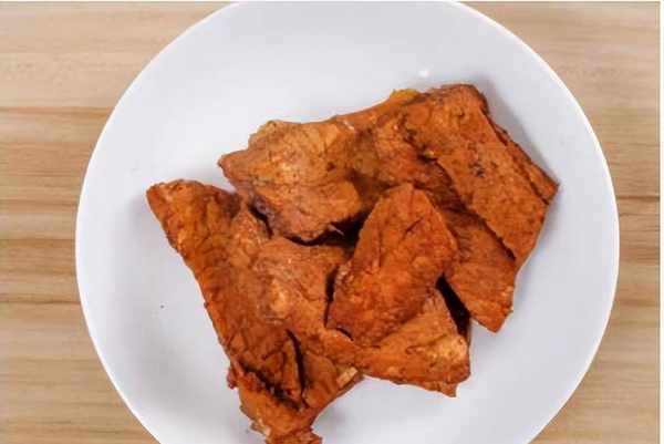 4、肉片用擀面杖压扁,然后将压好的肉片撕成条状。