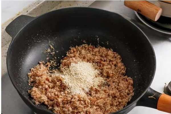 5、另起一锅倒入食用油烧热,加入肉丝翻炒,再加入白芝麻和糖,小火炒匀。