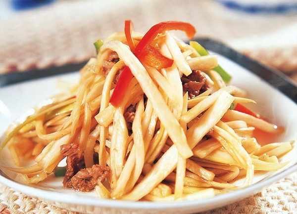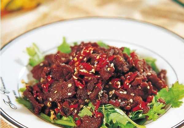 做法 1 牛肉去筋膜,切成薄片,加入泡打粉、酱油、胡椒粉、水淀粉、绍兴酒腌制10分钟。2 牛肉用60%的热油炸至肉变白,沥干油。