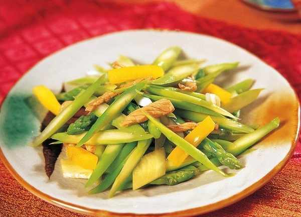 3 锅留底油,放入葱姜片,白糖,酱油,盐,味精,开水少许,勾芡,加入牛肉片和芦笋段搅拌均匀。