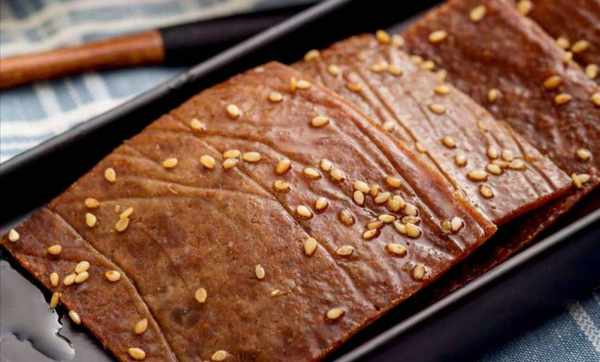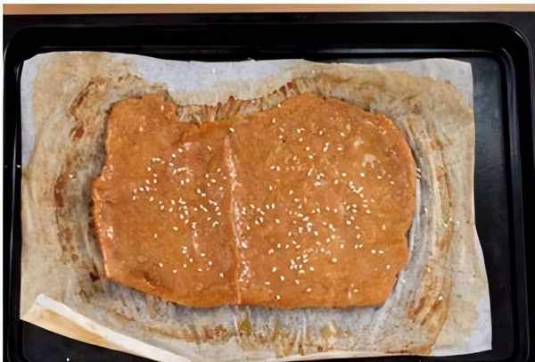 6、在肉干上撒上白芝麻,放入烤箱烤5分钟再取出。冷却后,切成块即可食用。