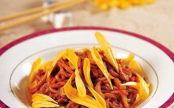 3 炒锅放油,烧热至20-30%火候,将羊肉条放入浆中,捞出油,放回炒锅中,加入准备好的芡汁翻炒,然后放入选好的菊花,翻炒两下,芡汁熟透,倒入少许油,起锅即可。
