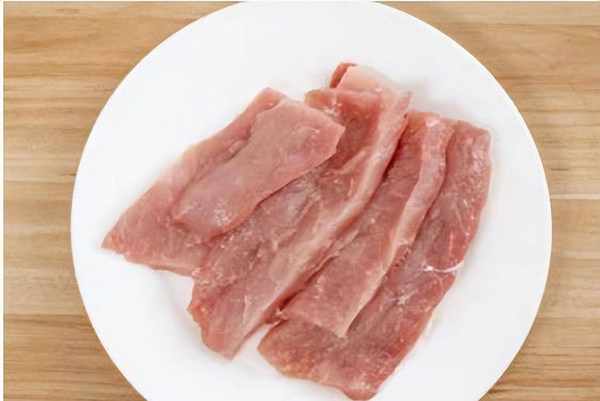 1、猪里脊肉洗净,去除脂肪和表面的白膜,切长片。