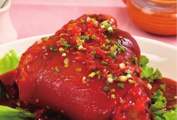 3 肘子煮软,捞出,撒上葱花和红辣椒碎。用水和淀粉检查汤汁,淋上油,浇在手肘上。