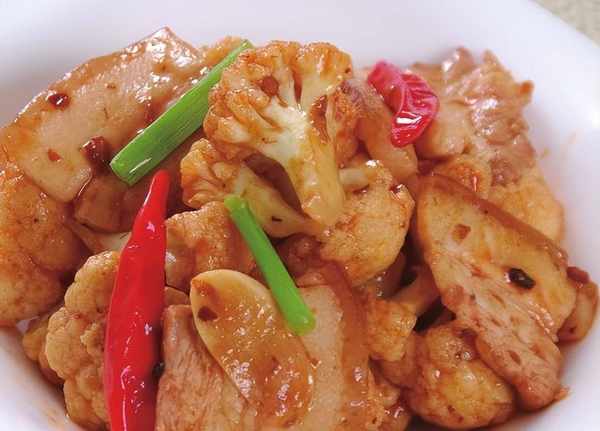 2 炒锅烧热油,将五花肉炒至油卷,加入葱蒜炒香,加入花菜炒香,加入适量开水煮熟,加盐,鸡精粉和酱油炒熟。