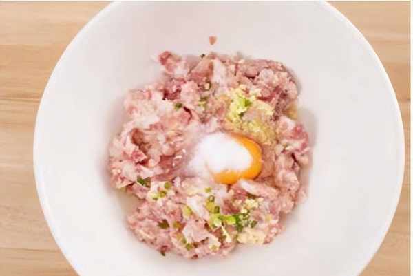 2 用蛋液和香料(水淀粉除外)制作猪肉意面,压成大小均匀的球,蘸上糯米,放入笼中。