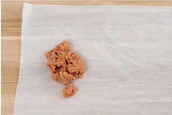 3.撕下1张烤纸(烤盘的两倍大),将肉均匀铺在烤纸上,将多余的烤纸翻过来盖住肉。