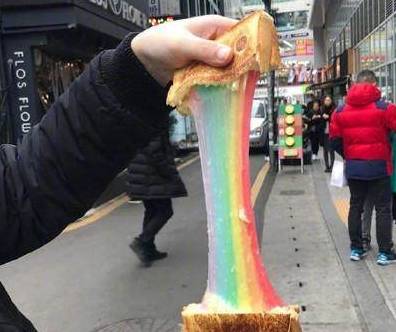 掰开中间,会有彩虹颜色的芝士出来!彩虹包主要是以各种颜色的因素糖果去制作成面包,比脏脏包看起来更有食欲一些,也是吸引了蛮多网友去品尝。