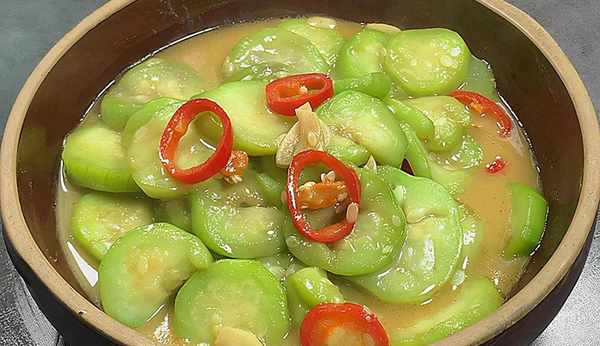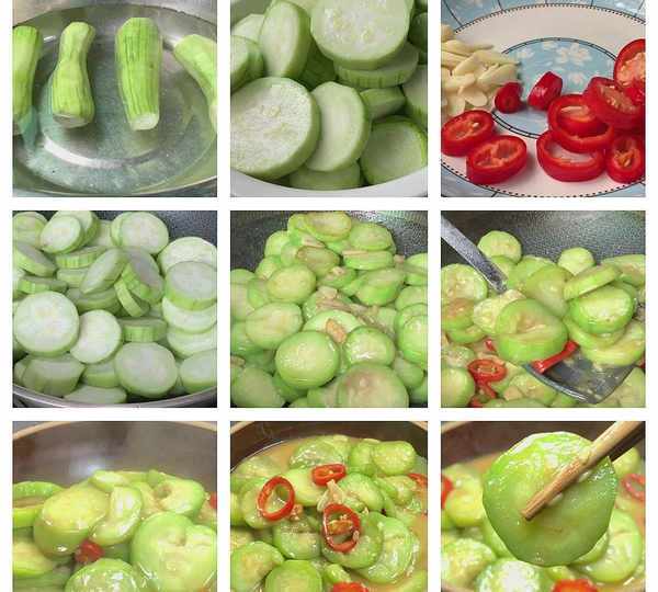【食材】:丝瓜4根,红椒1个,大蒜3瓣,盐,味精。