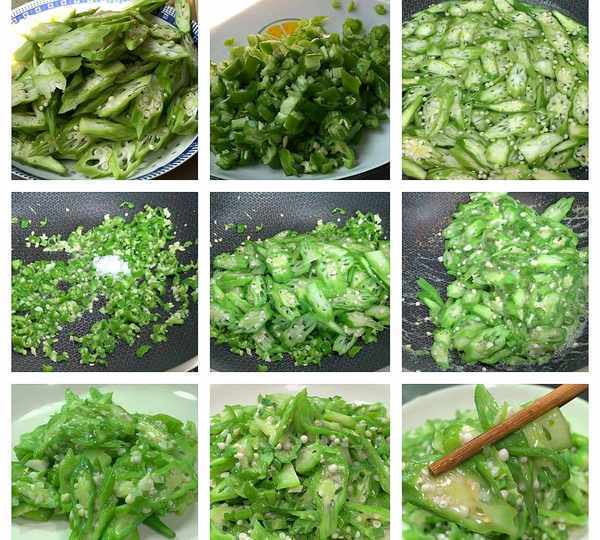 【食材】:秋葵 8根,青椒300克,盐,鸡精。