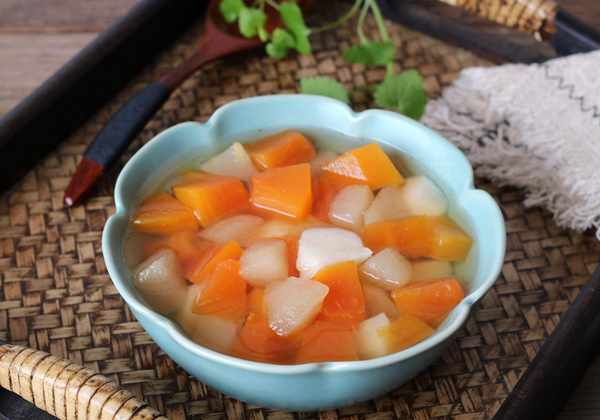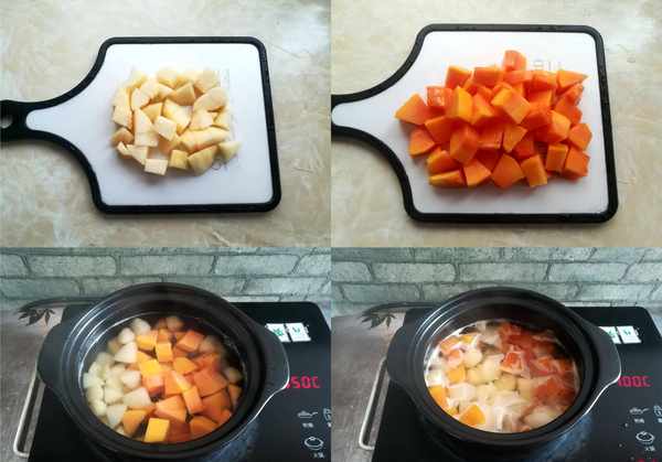 木瓜和梨一起煮,润肤美容。常吃木瓜对皮肤有好处。这两种水果的搭配也很好看,看着就很有食欲。