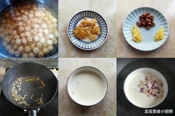 5.将牛奶倒入深碗中,加入鱼肚、姜丝和红枣丁。