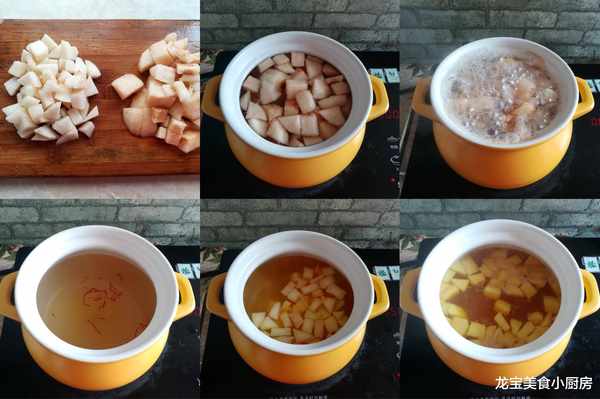 3.大火烧开,转中火煮5分钟,捞出梨块。