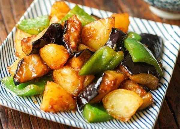 4:锅底留少许清油,加入葱、姜、蒜爆香,倒入青椒、土豆、茄子翻炒均匀,淋上准备好的酱汁翻炒片刻一会儿,就出锅了。