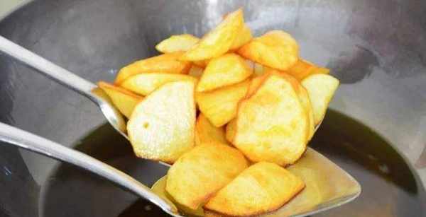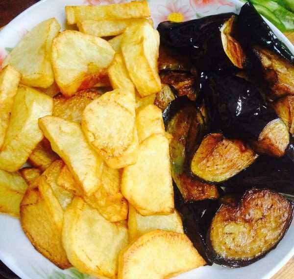 2:锅中倒入油烧热,将切好的土豆炸至金黄捞出待用。然后将茄子炸至微黄,然后取出备用;