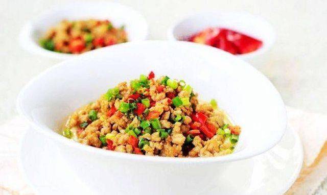 主料:鸡蛋、瘦肉辅料:植物油、盐、淀粉、鲜味、姜、葱、鸡精、红辣椒、香油、花椒做法:1.将鸡蛋打散,用打蛋器搅拌均匀,加入Mix冷水和盐拌匀,加少许植物油拌匀,盖上保鲜膜,用牙签扎几个小孔2.蒸锅加入冷水,加入蛋液,中小火蒸10分钟左右大火,取出3.葱姜洗净剁碎,红辣椒洗净剁细,瘦肉剁碎,加入鲜味,与淀粉拌匀,加入香油,拌匀静置片刻入味翻炒肉末去水分和香味,加入红辣椒翻炒出蛋奶香味,用勺子挖着一起吃