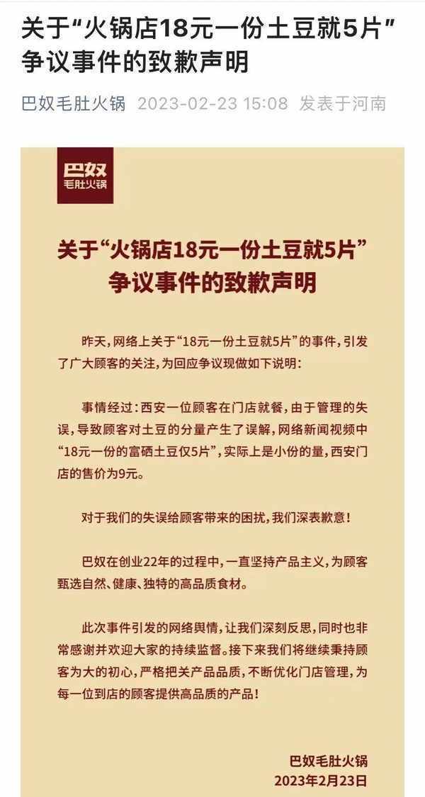 2月23日,巴奴毛肚火锅公众号就18元一份土豆就5片事件发布致歉公告。巴奴毛肚火锅 表示,由于管理的失误,导致顾客对土豆的分量产生了误解,网络新闻视频中“18元一份的富硒土豆仅5片”实际上是小份的量,西安门店的售价为9元。