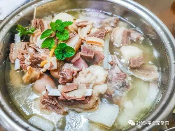 5、开盖,加入白萝卜一起再炖30分钟,最后加入适量的盐,起锅以少许薄荷叶点缀增色增香。