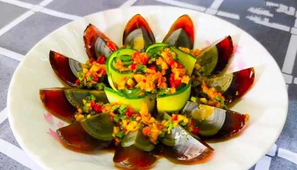 2、皮蛋凉后剥掉外壳清洗一下,在刀上擦一点植物油,切皮蛋不容易粘在刀上,把皮蛋分成四份切好后摆盘,再削几片青瓜片卷起来,把它放入盘中间。