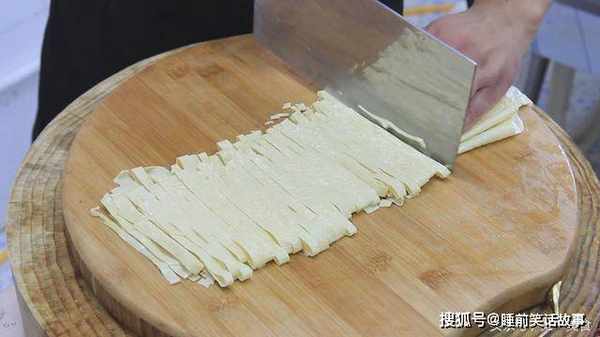 泡好以后,叠起来切成豆皮丝,清洗干净,捞出来,放在盆中。