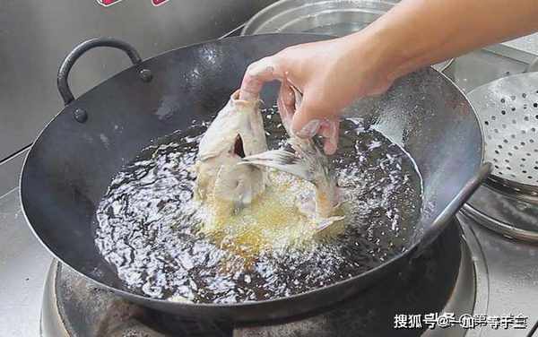 取出鲤鱼,抠着鱼头和鱼尾,把鱼身先放入油锅,开小火,先把鱼身炸至定型,这个定型时间在1分钟左右,小心不要烧到手