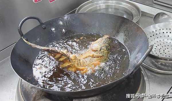 鱼尾炸好以后开始炸鱼头,把鱼身翻一下,把没有炸到的地方浸在油里面,期间用勺子不停的把热油浇在露出油面的部分,(这个过程要持续五分钟到六分钟时间),一定要开中火,把鱼炸至金黄酥脆,用筷子能轻松扎透时,即可出锅控油,然后摆入盘中。
