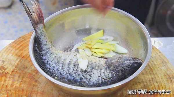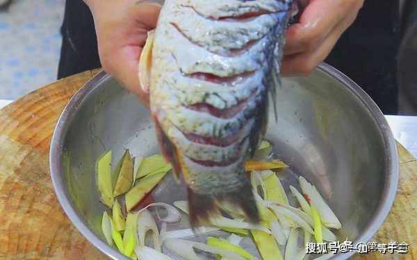 大葱白一根,斜切成马蹄片,生姜一块切成薄片,把葱白和生姜,倒在装有鲤鱼的盘中。