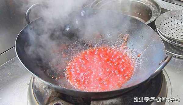下面我们开始调糖醋汁,锅内留底油,加入番茄酱30克,用勺子把番茄酱炒匀化开,加入适量的清水,把糖醋汁搅成糊状,加入白糖50克,食盐1克,再加入白醋20克,番茄酱是酸的,要少放一点白醋即可。