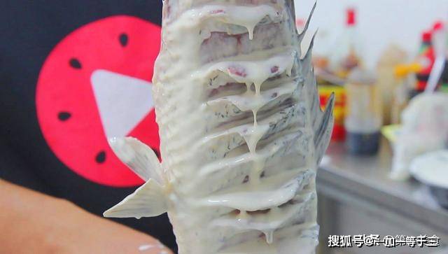 取出鲤鱼,除去鱼身的大葱和生姜,把鲤鱼放入面糊内,在鱼身上均匀的抹上面糊,最好把每个切开的刀口上都抹上面糊