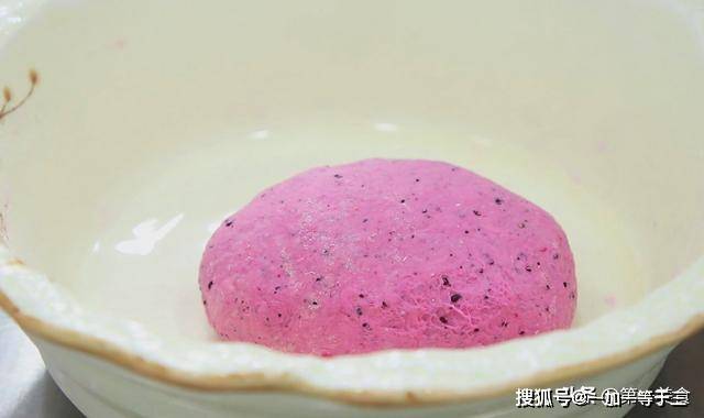准备一个小盆,放入面粉200克,用温水化开2克酵母倒入到面粉中,然后把火龙果汁倒入面粉中。