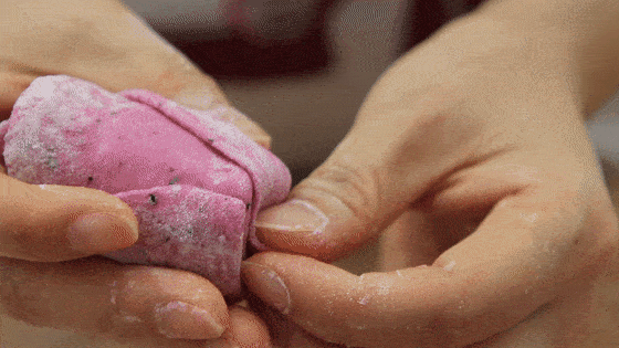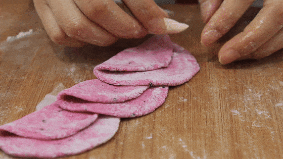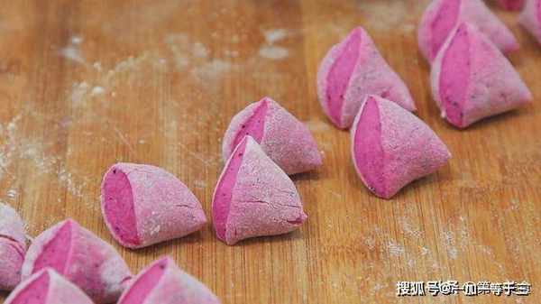 再搓一点白色的小面剂子,把紫色的面皮折起来,三个排成一排,中间放上这个小白面剂子卷起来。