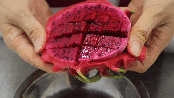 首先,准备一个红心火龙果, 用刀子先划成小块,然后把火龙果皮外翻,火龙果块就自动掉下来。