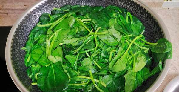 第一步:菠菜两把去掉根部在清洗干净,而后开水下锅,焯烫2分钟去除草酸和涩味,而后捞出用凉水冷却,在挤干水分放入盆中备用。