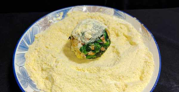 第五步:取玉米粉一碗,再来三分之一的干淀粉混合均匀,取适量菠菜馅料用双手攥成丸子,而后在玉米粉里滚一滚,沾满玉米粉后拿起来再用双后团一团,而后再放到玉米粉中滚一滚,直至均匀裹满玉米粉为止。
