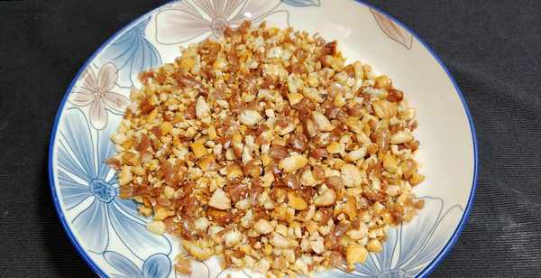 第三步:准备一把花生米可以采用烘烤的方式烤熟,也可以采用油炸的方式炸酥,而后将熟花生米装入一个塑料袋中,用擀面杖敲一敲,敲碎成大颗粒的状态即可。