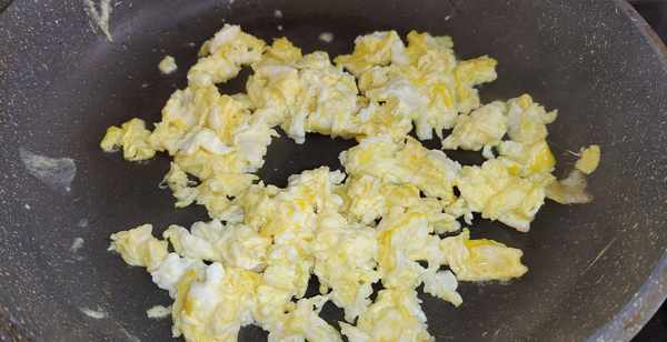 第二步:鸡蛋三个打散后入油锅炒熟炒碎,可以炒的稍微老一点,这样味道更香。