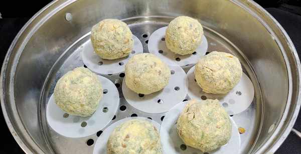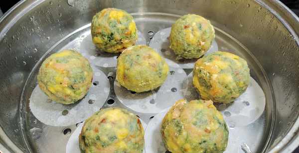 第六步:所有菠菜玉米团子全部上蒸锅,开大火至锅内上汽时开始计时,大约8分钟就可以关火出锅了。