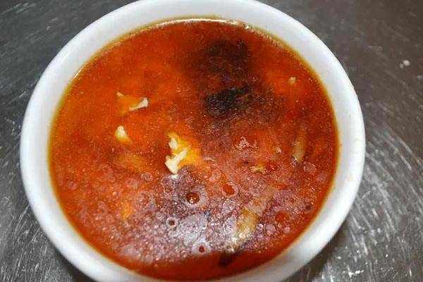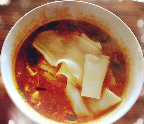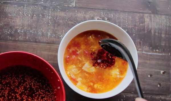 吃面之前,先调上一小碗蘸汁。这蘸汁是用西红柿、蛋花、姜、蒜、红辣椒、口蘑等熬制而成的。调的时候可以根据个人喜好加入油泼辣子或者醋等。不过,一般加勺油泼辣子即可!