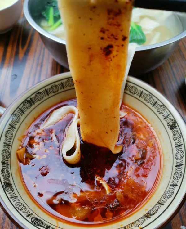 这一根面差不多有3到5厘米宽,长应该有一米多了,就这样沿着盆边慢慢地将一根面条送入蘸汁碗里。那香辣又红彤彤的汁儿全都附着在光滑的面条上。这么吸溜一口真的是太香了!