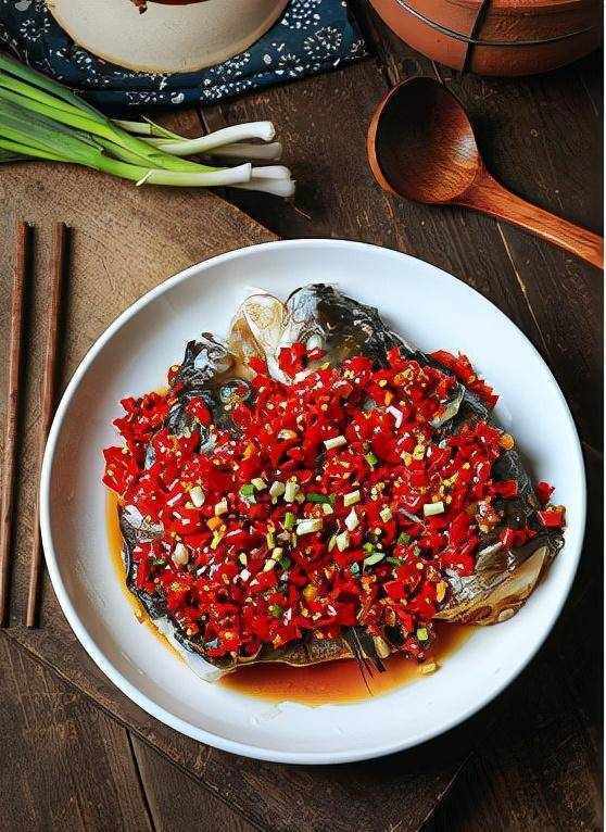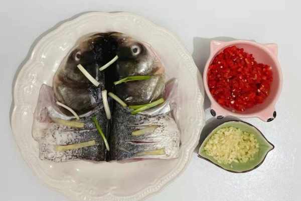 【原料】鱼头、剁椒、葱姜蒜、料酒、小米椒、黑豆酱、糖、蚝油、生抽、盐、葱花、蒸鱼露