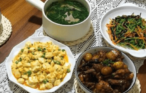 炒豆腐,栗子炖鸡腿,凉菜,菠菜豆腐汤