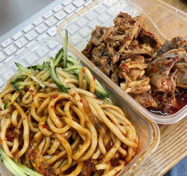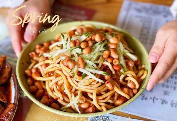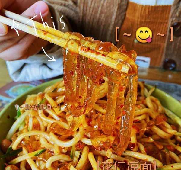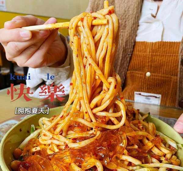 面条柔韧筋道,黄瓜清脆爽口。饱浸了辣油香醋,鲜红、晶莹,光是闻着酸酸甜甜的味道,食欲就被打开了。