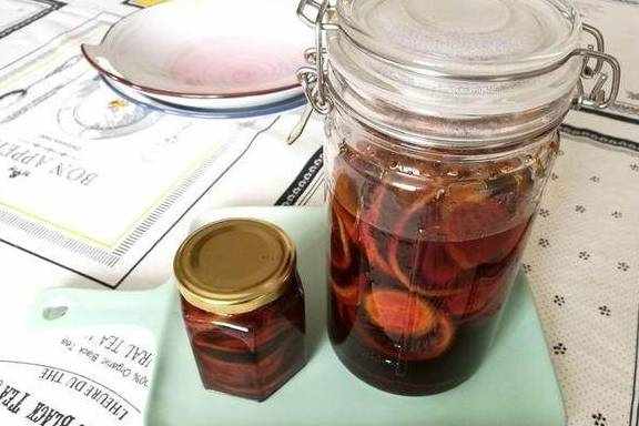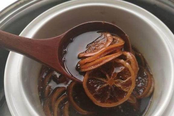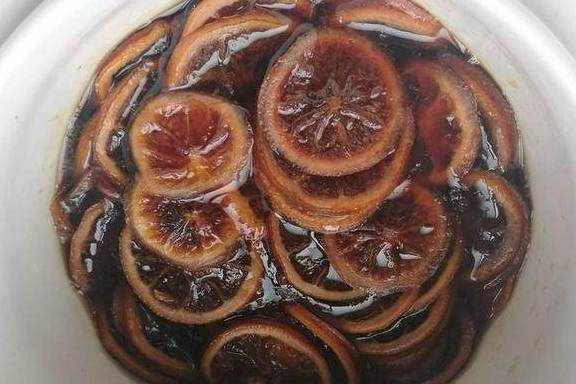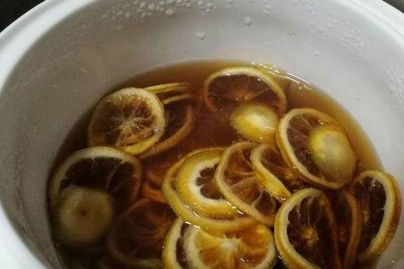 6.这是炖了12个小时的样子,颜色呈深褐色。炖足10小时的冰糖炖柠檬才会有止咳功效哈。