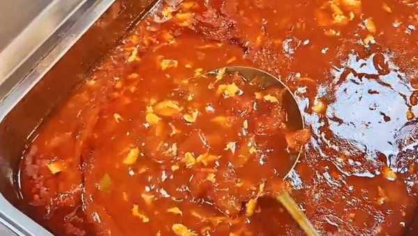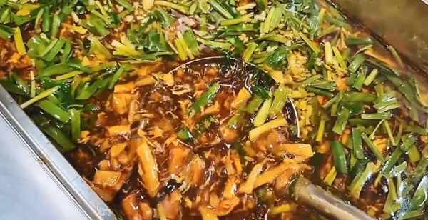 而且他们家的过油肉不是用大火烧出来的,是用小火慢慢地烤,味道也会更好。最重要的一点就是他们家做凉菜用的料油都是用十几种调料熬出来的,所以不仅闻着香,就是吃起来的口感也会非常的好。