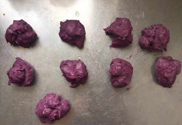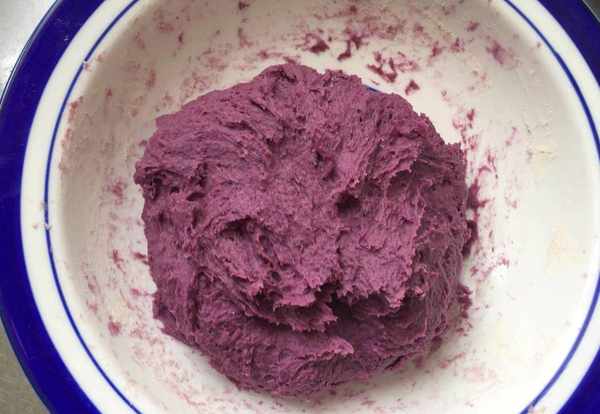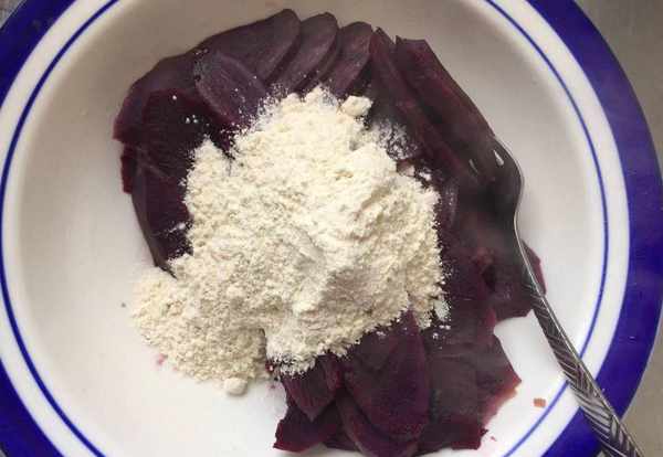 1,紫薯蒸制好之后立即放入面粉,这样也起到了一个烫面的作用,可以使饼更柔软。