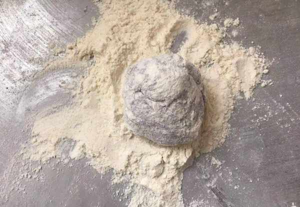 7,准备多一些的荞麦面粉,再把分好的小面团放入荞麦面粉中滚一圈,这样可以有效防止粘手,如上图所示。