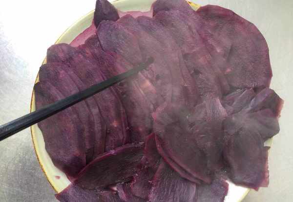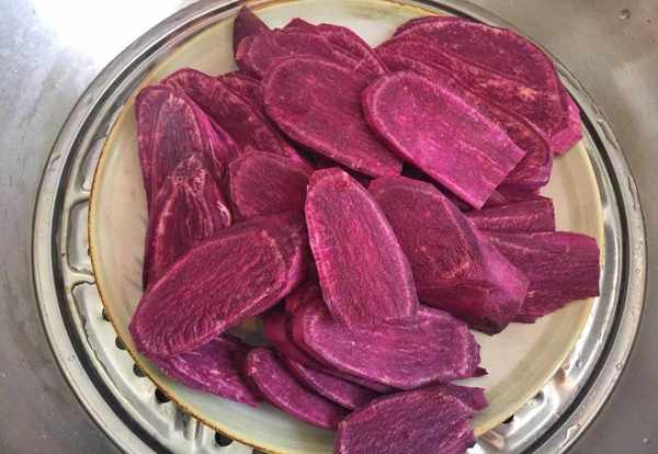 2,再切成薄一些的大片,放入蒸锅蒸制大约10分钟,这一步也可以把紫薯切成滚刀块,用水煮至变软,紫薯比较好熟,大家根据自己的操作习惯选择顺手的方法就可以了,如上图所示。
