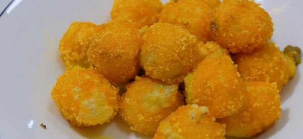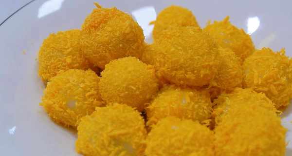 6、取出准备好的面包屑小盘,将汤圆在面包屑中滚动,使汤圆表面沾满面包屑,然后取出装盘待用。锅里再倒一点食用油,把油烧到50%热,把汤圆一个一个放进油锅里,不要急着把汤圆倒进锅里,炸到熟了被设置。汤圆入锅的速度不能太慢,否则有的会煮烂,有的会生。